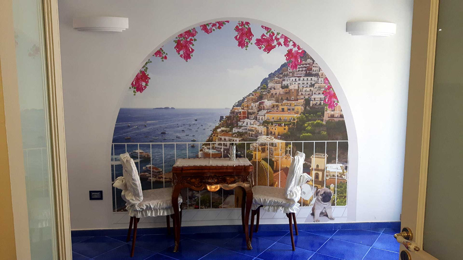 Realizzato simulando la tecnica trompe l'oeil, rappresentando un terrazzo con vista, dalla finestra ad arco, su un viale con cipressi, classico paesaggio della Toscana. Ideale per decorare la parete di un salone o di un vano scale.